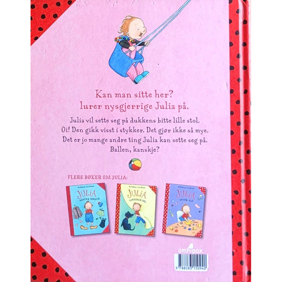 Julia vil sette seg på dukkens bitte lille stol. Oi! Den gikk visst i stykker. Det gjør ikke så mye. Det er jo mange andre ting Julia kan sette seg på. Ballen, kanskje?